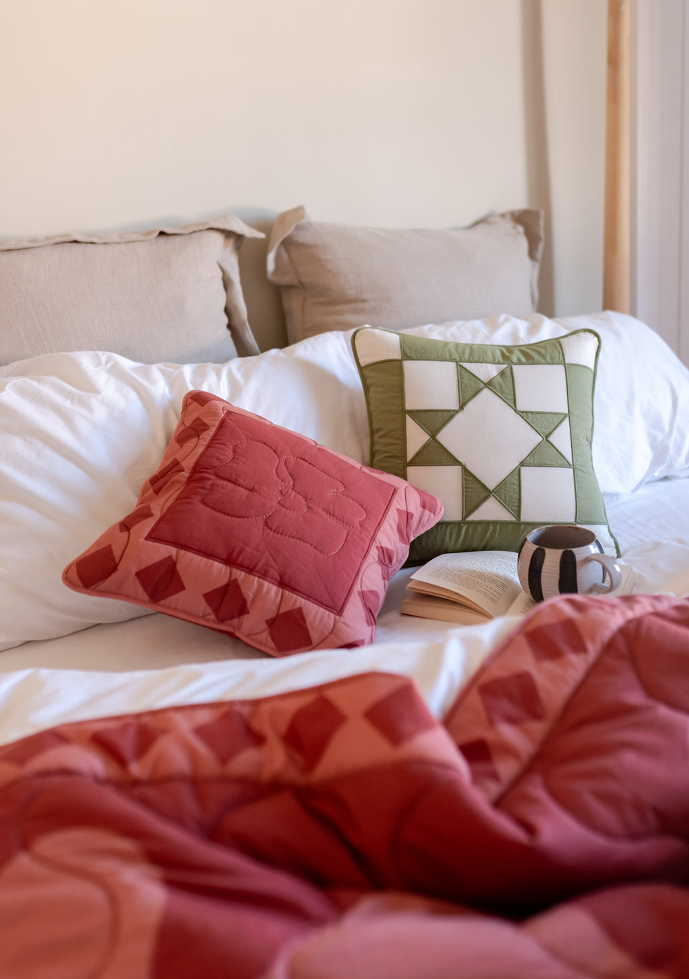 Add colour, texture and joy to your space with this statement cushion cover woven from surplus sustainable cotton. Its red and pink quilted floral pattern adds energetic vibes into your space, while its quilted texture adds interest to your sofa, bed or chairs. It is woven from surplus fabric from our quilted throw range, so nothing goes to waste. Best paired with a TBCo blanket and a long, slow morning at home.