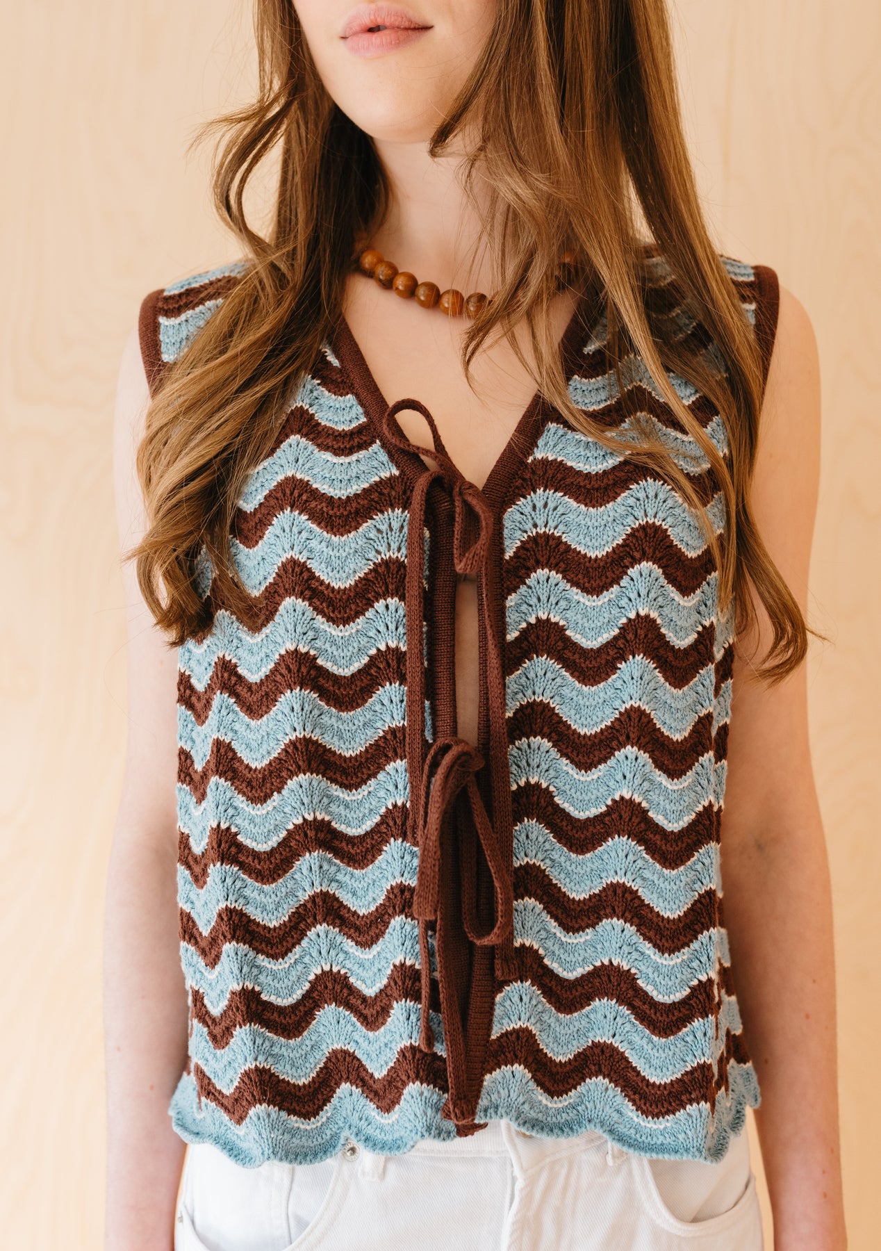 This knitted vest in a blue and brown soft wave stripe is made from 100% high-quality cotton, with two front ties for adjustable styling. Crafted in a delicate pointelle weave, it is both breathable and lightweight, making it ideal for layering or wearing alone.