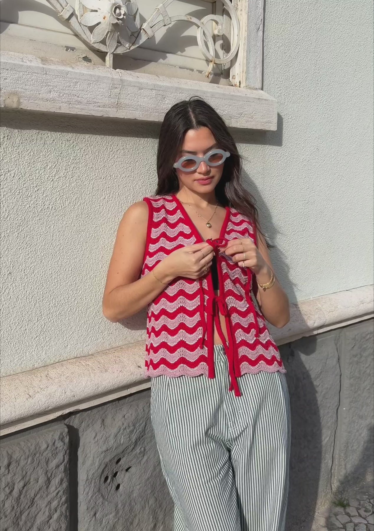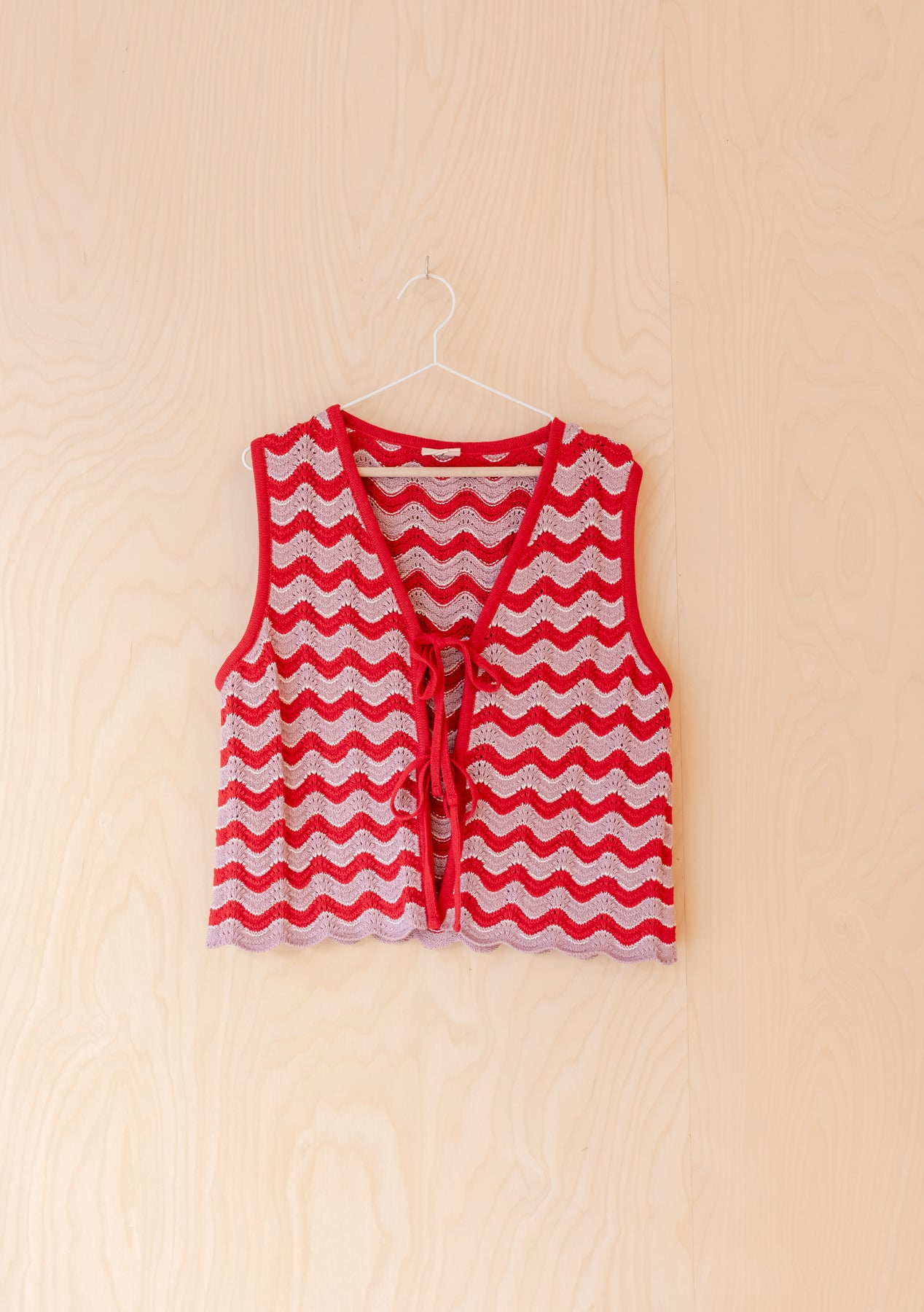 This knitted vest in a pink and red soft wave stripe is made from 100% high-quality cotton, with two front ties for adjustable styling. Crafted in a delicate pointelle weave, it is both breathable and lightweight, making it ideal for layering or wearing alone.