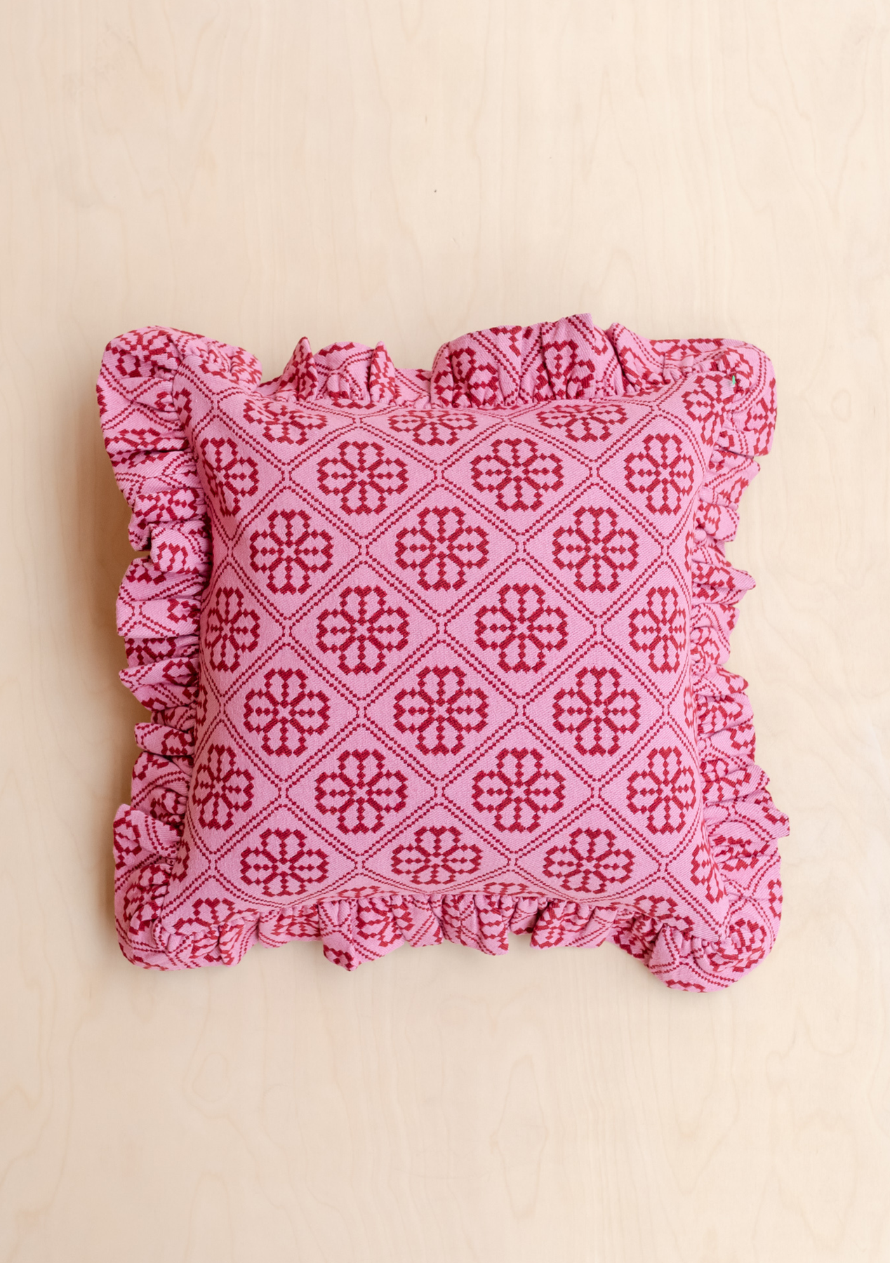 This pink and red floral jacquard cushion cover is woven from a durable blend of high-quality cotton and recycled mixed fibres. The soft square shape and delicate ruffled edge make it a versatile addition to any interior. Mix or match across sofas, beds and corners for easy updates with impact.
