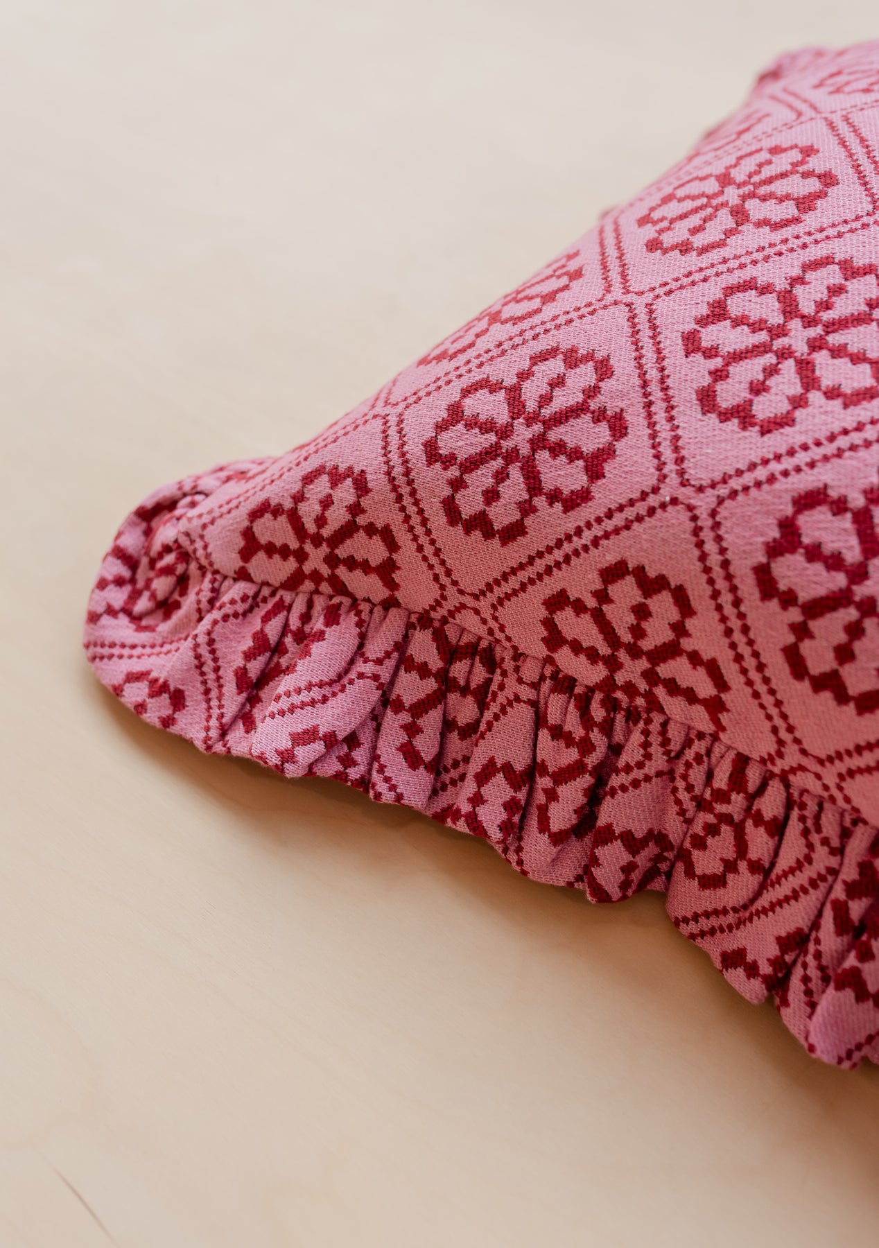 Close-up of the ruffled edge on TBCo’s Cotton Cushion Cover in Pink Floral, gallery position 3, portrait orientation.