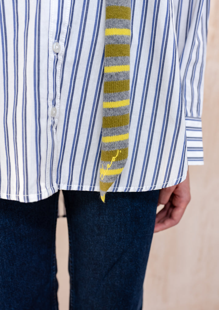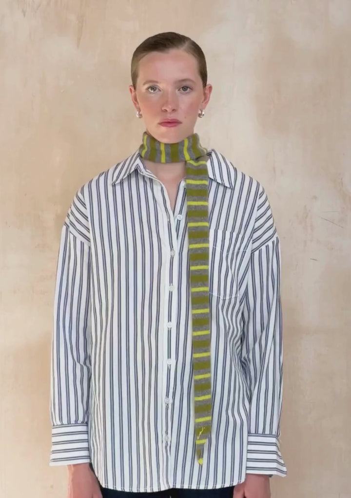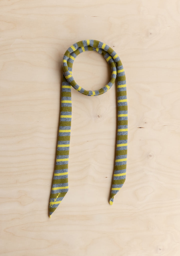 In einer Saison des Lagenlooks können die kleinsten Stücke den größten Auftritt haben. Inspiriert von Vintage-Showmanship und aus butterweicher Merinowolle gefertigt, ist diese TBCo-Krawatte mit grünen, grauen und gelben Streifen eine spielerische Interpretation der Tradition. Leicht und atmungsaktiv, ist sie perfekt für den Saisonwechsel – die Art von Schal, den Sie vergessen, bis Ihnen jemand ein Kompliment macht.