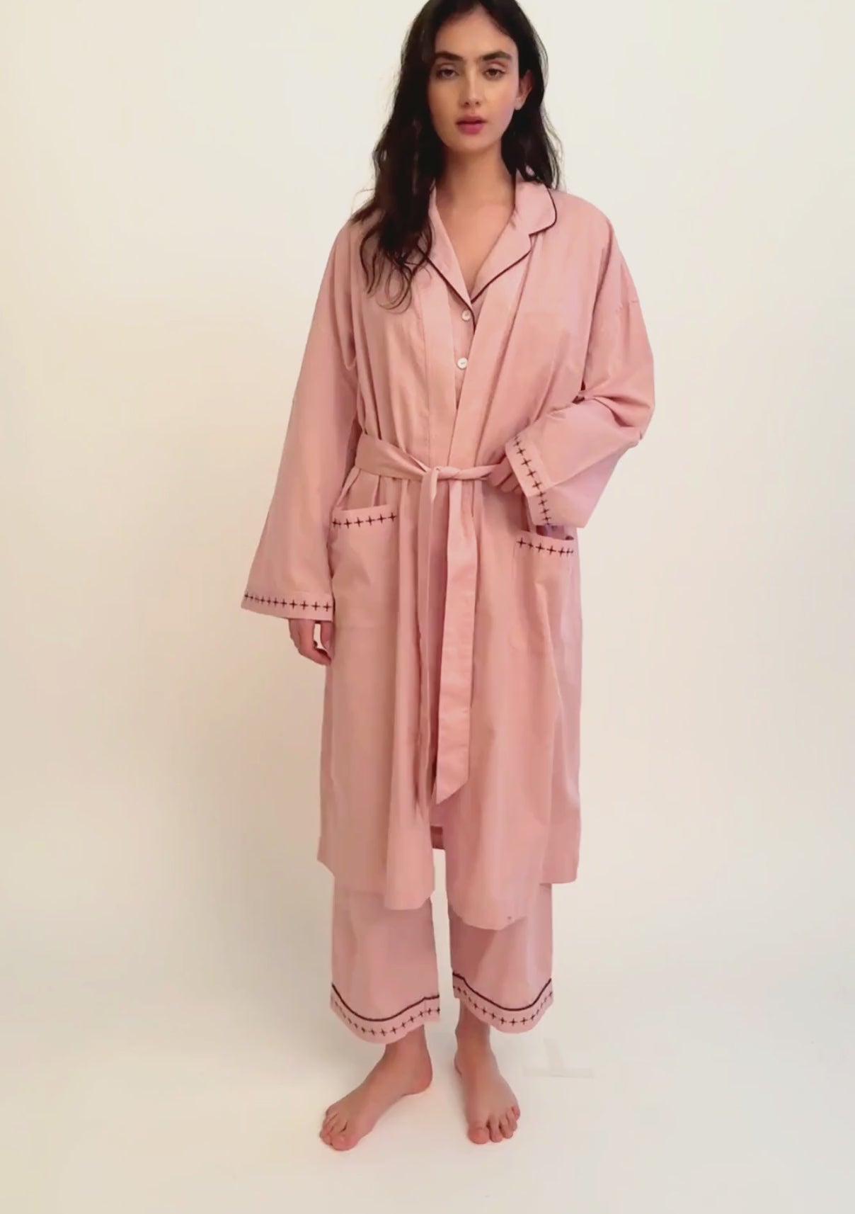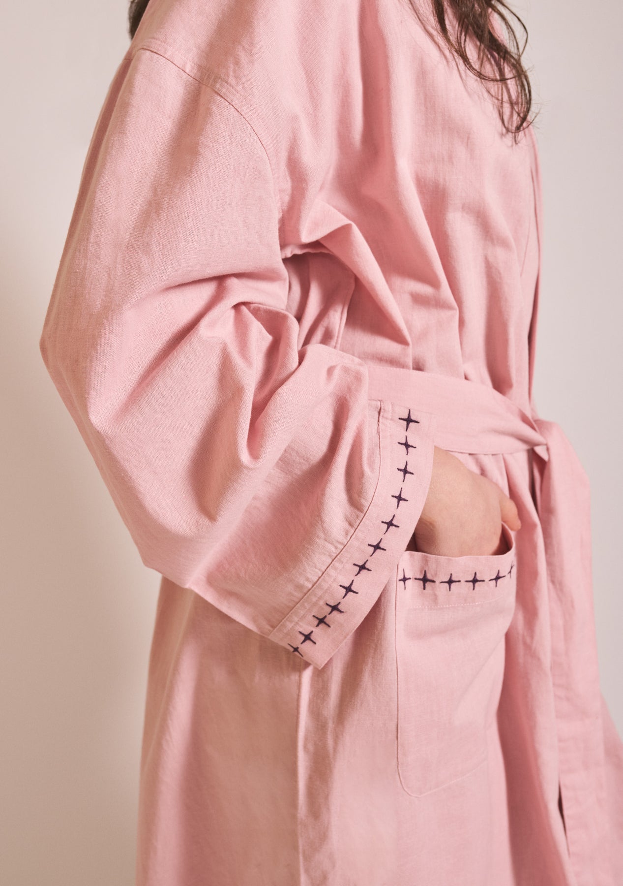 Dieser rosafarbene Bademantel mit Brombeerstickerei aus einem Baumwoll-Leinen-Gemisch ist angenehm zu tragen und atmungsaktiv. Dank des eingenähten Bindebands geht er nicht verloren. Der lockere Schnitt sorgt für einen fließenden Fall und er kann sowohl über einem passenden Pyjama als auch als bequeme Loungewear getragen werden.